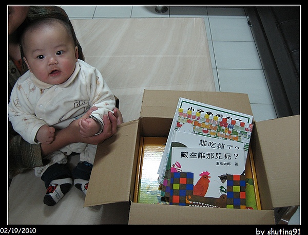 好有氣質的書喔,小Ray的爸爸馬上打開來唸了幾頁給小Ray聽,坐在他爸爸的腿上,這個五個月的男嬰卻只懂得看可愛的圖片,開心的動來動去的。